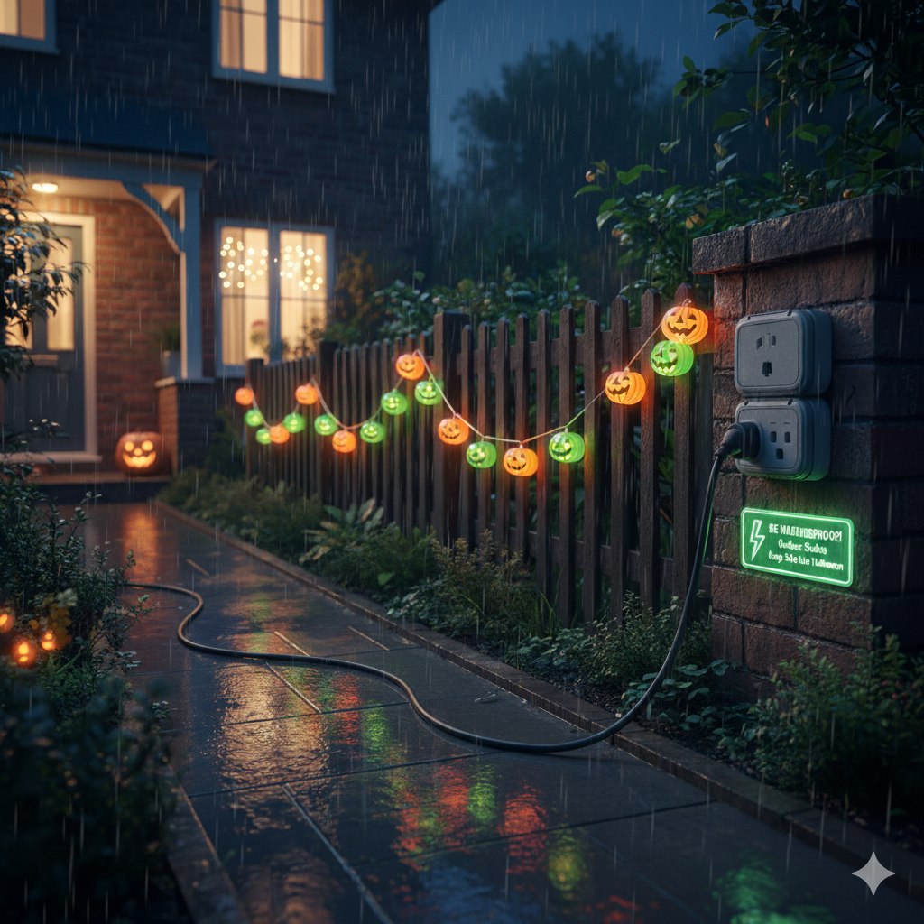 Halloween means lights in windows, fairy lights on fences, and the odd pumpkin on the doorstep. Just make sure outdoor fittings and cables are rated for external use.